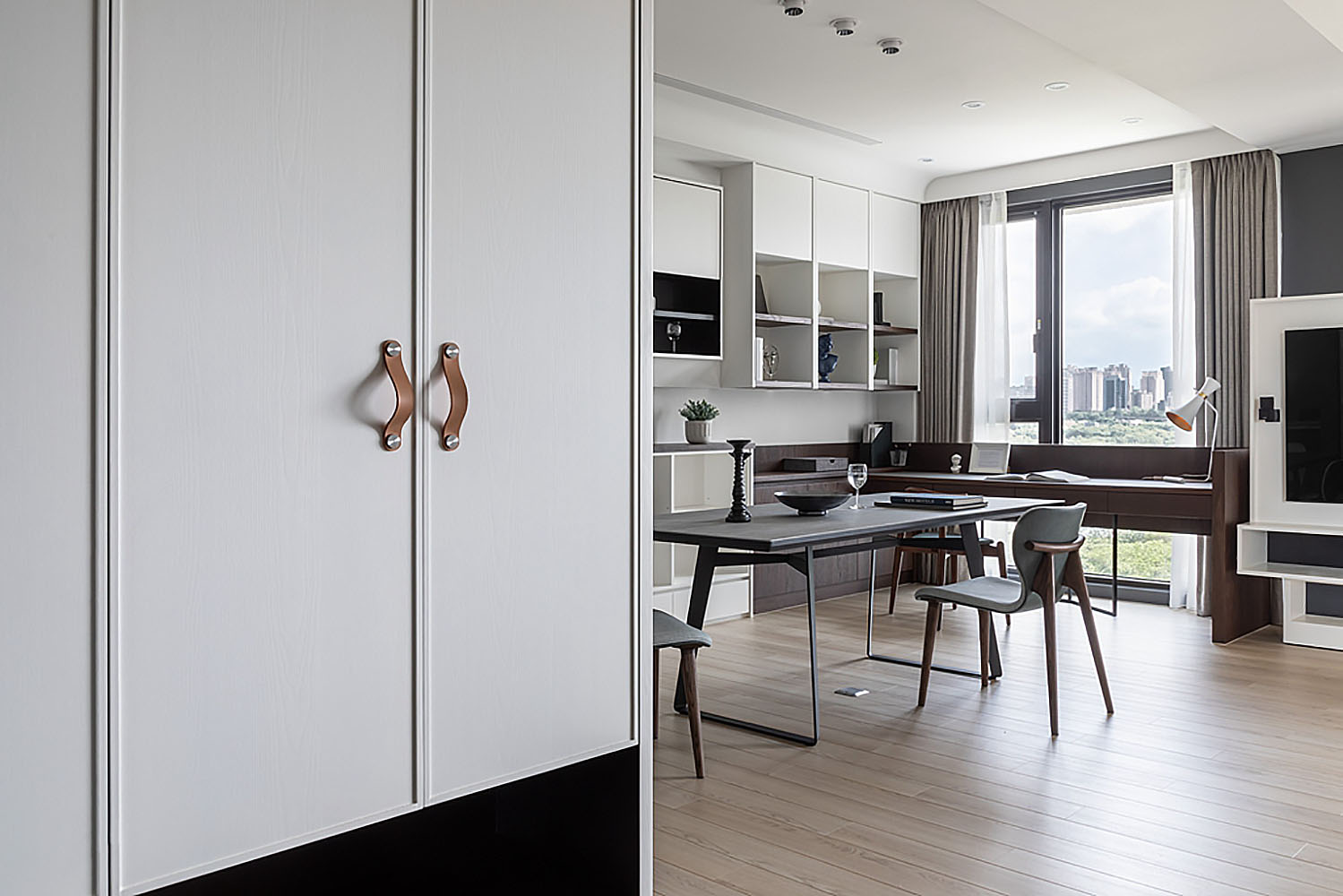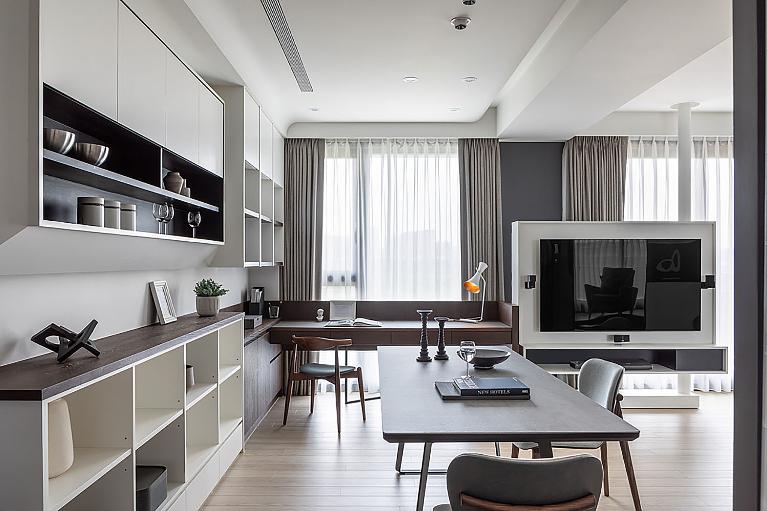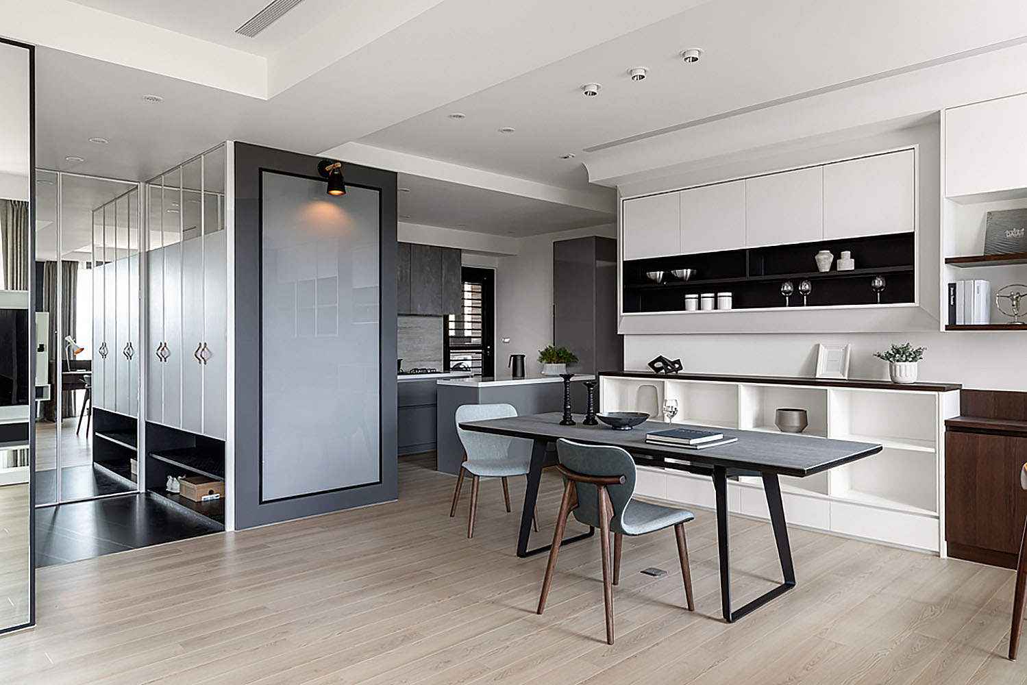 玄關高鞋櫃門片規劃鏡面,延伸入口空間感及兼具方便穿搭的實用性。客廳與書房為開放的規劃,客廳牆面跳灰黑色,櫃體則以木皮噴白方式呈現,捨棄傳統電視櫃,規劃旋轉電視櫃,讓客廳及書房都可使用,書房色調也以白及黑加上深咖啡色木皮為主,現代感帶點沉穩,同時兼具餐廳使用,廚房採開放式,灰色調系統板加上白色人造石。