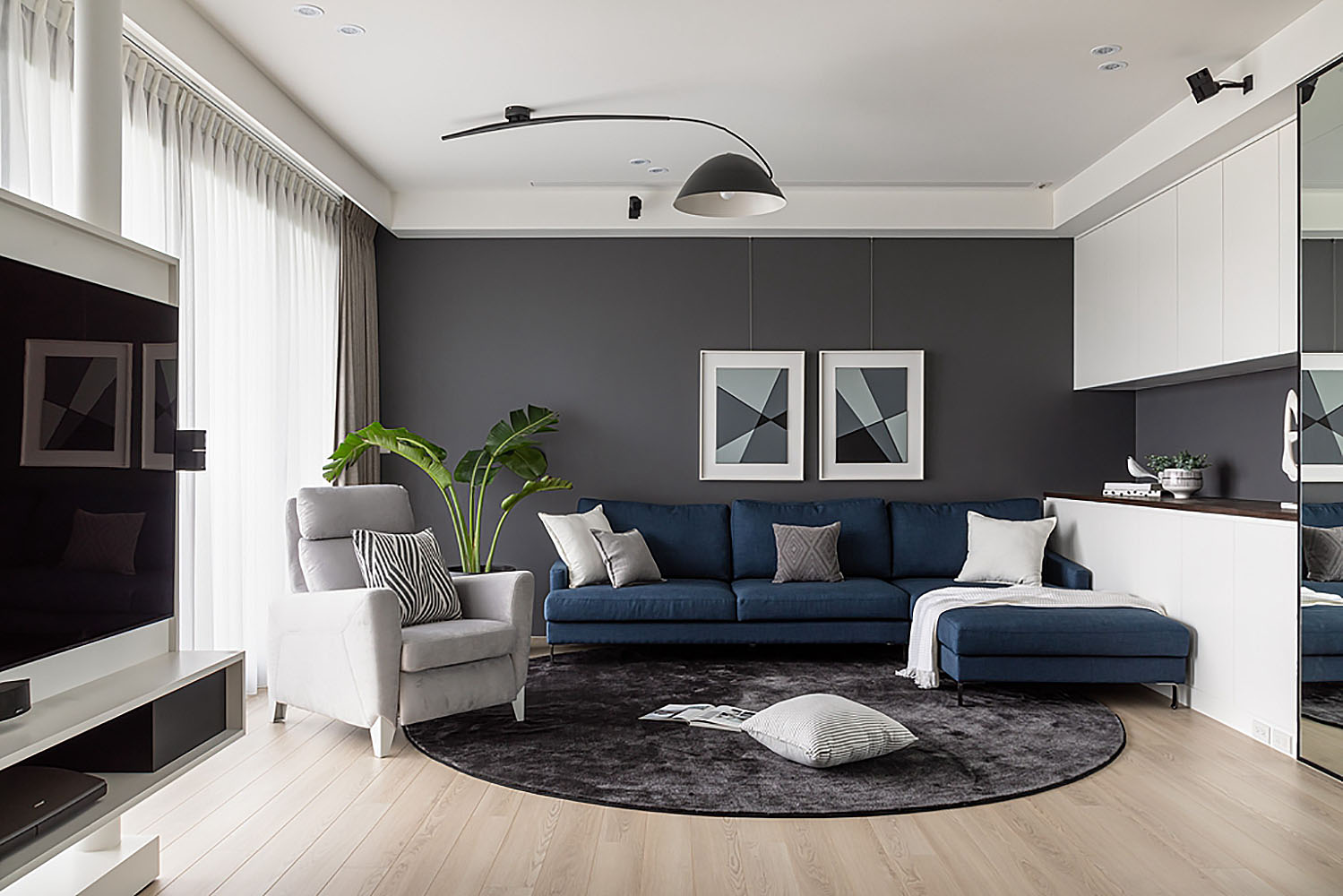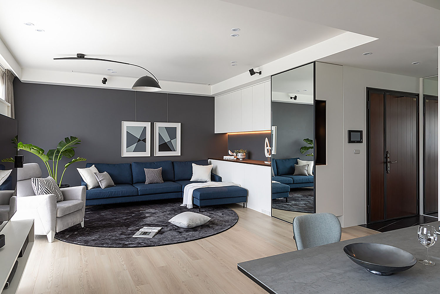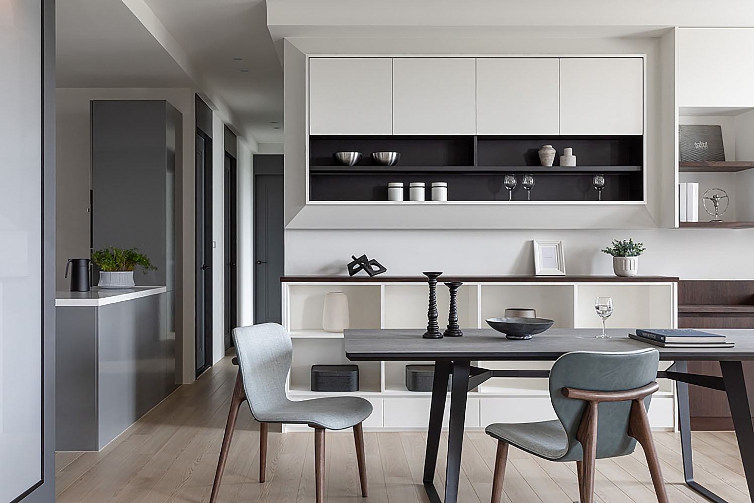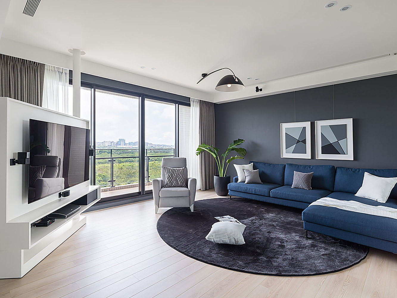本案業主為擁有兩個小孩的小家庭,喜好開放式通透的空間感,新居為4房2廳3衛,現代感帶點休閒的設計風格。新居位於河岸邊,擁有開闊的視野及良好的採光,設計規劃以灰黑為基底,再搭配淺色木地板,平衡冷與暖的比例。
