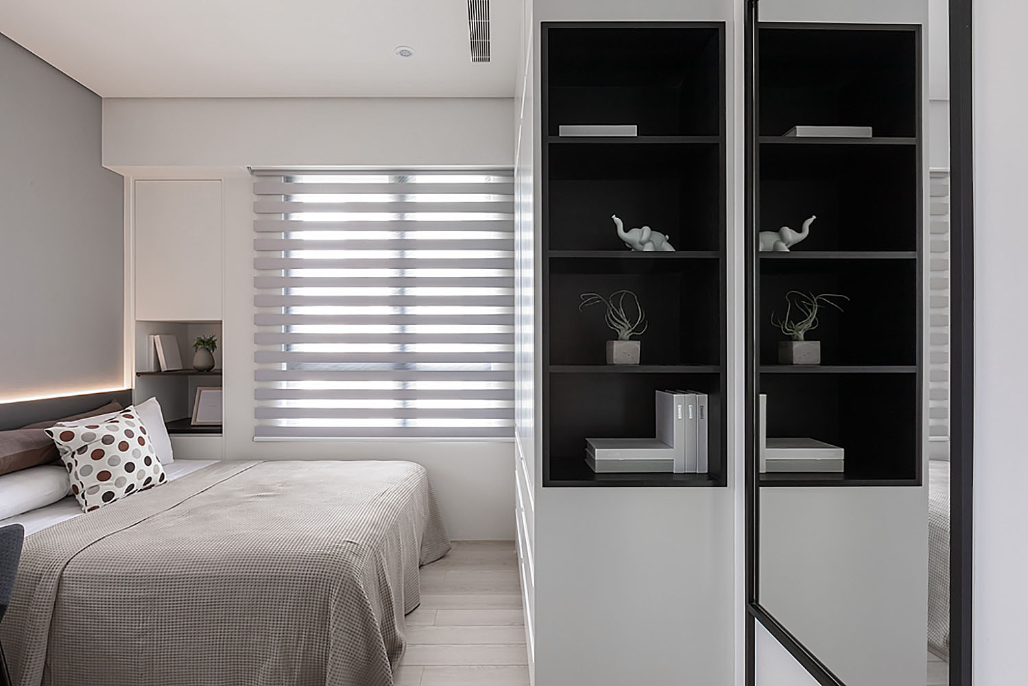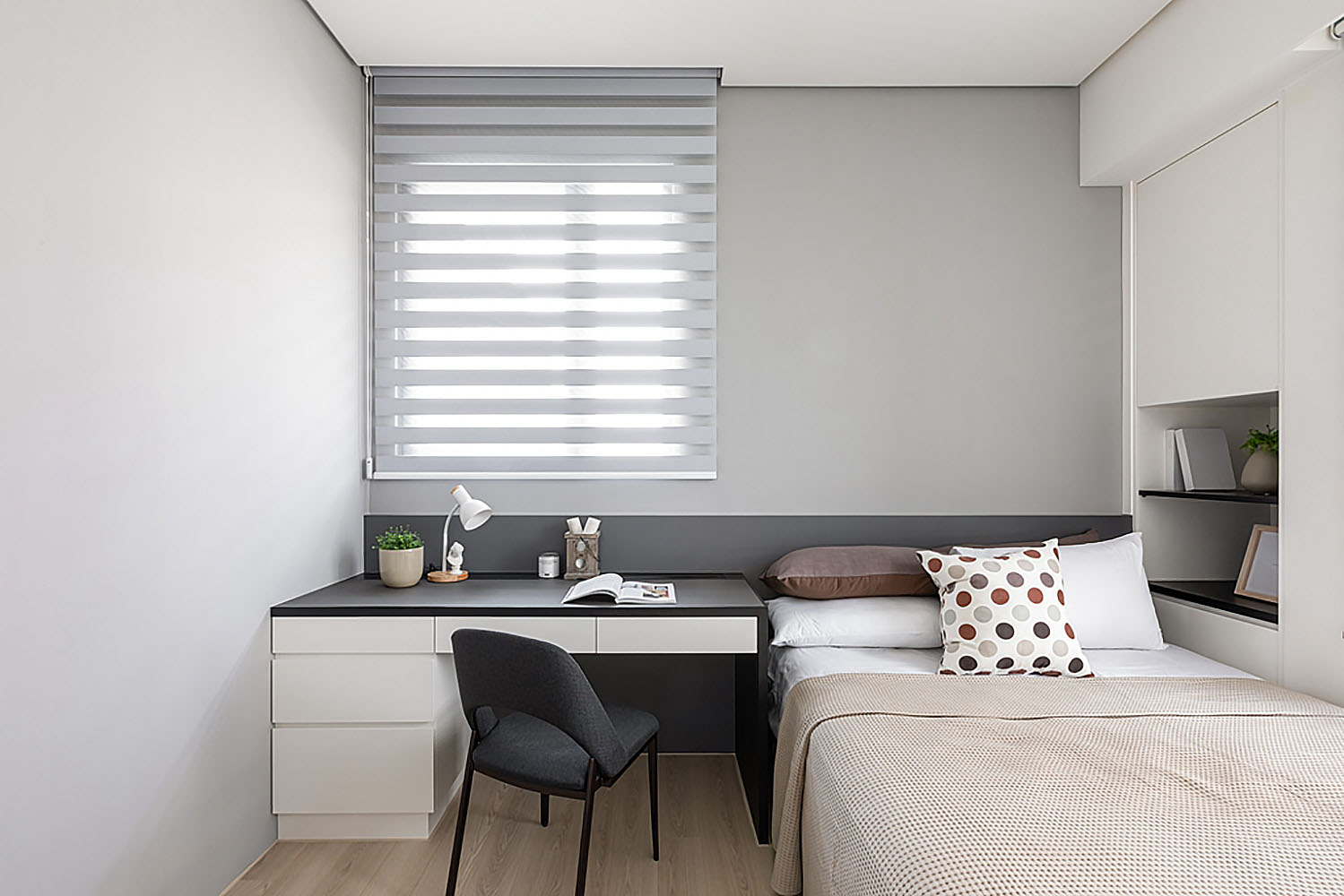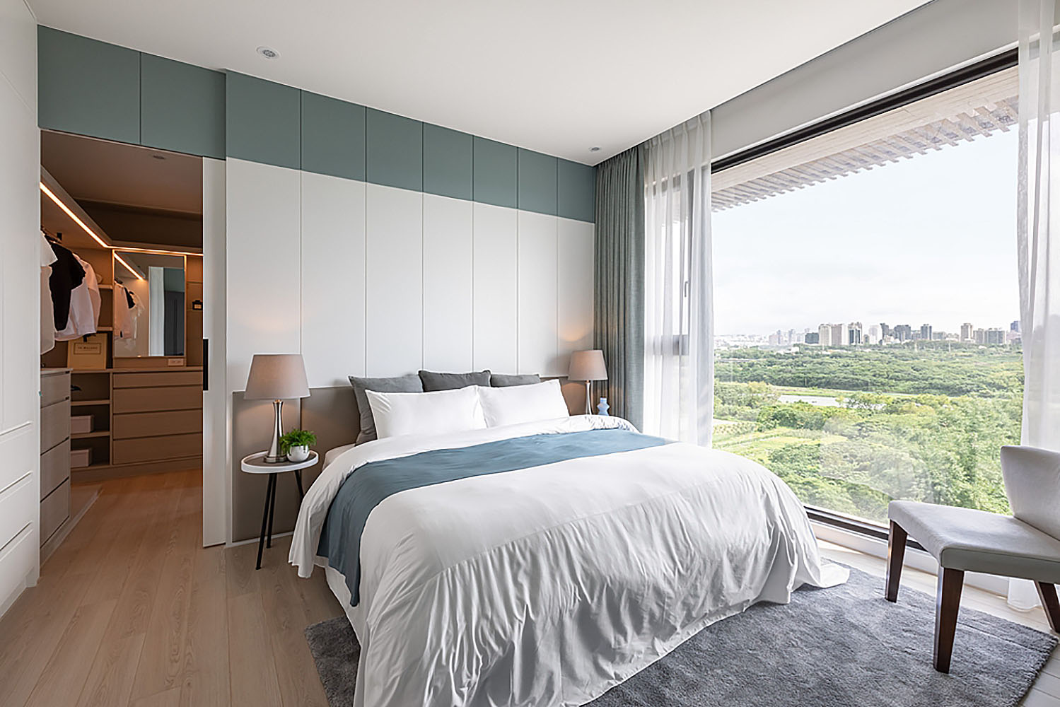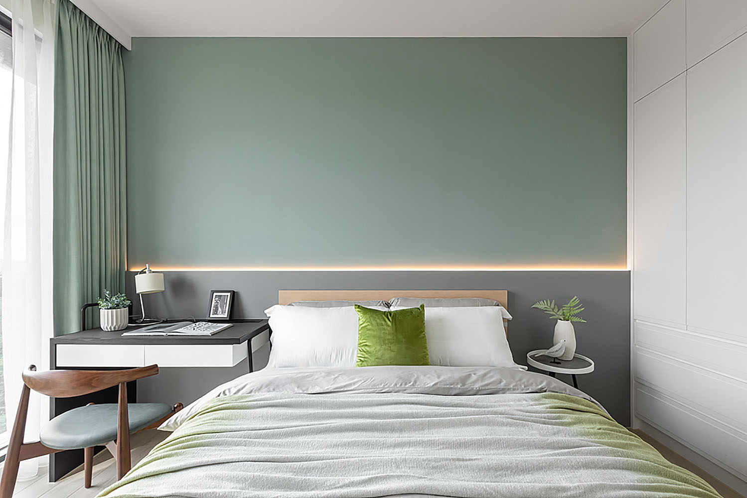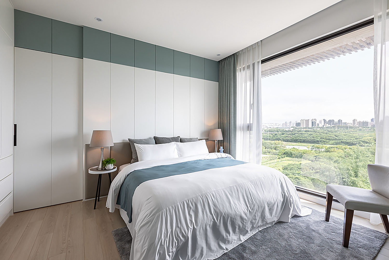 主臥則跳脫公共區域的黑白灰,色調為白及綠,加上大片落地窗,讓陽光及綠意灑進;次臥以白灰綠搭配,多點層次及活潑,床頭背板上方規劃線型燈,為冷色調的灰與綠帶點溫暖之感;小孩房色調為淺灰深灰及白,利用不同的灰,讓空間有不同層次,既活潑又內斂。
